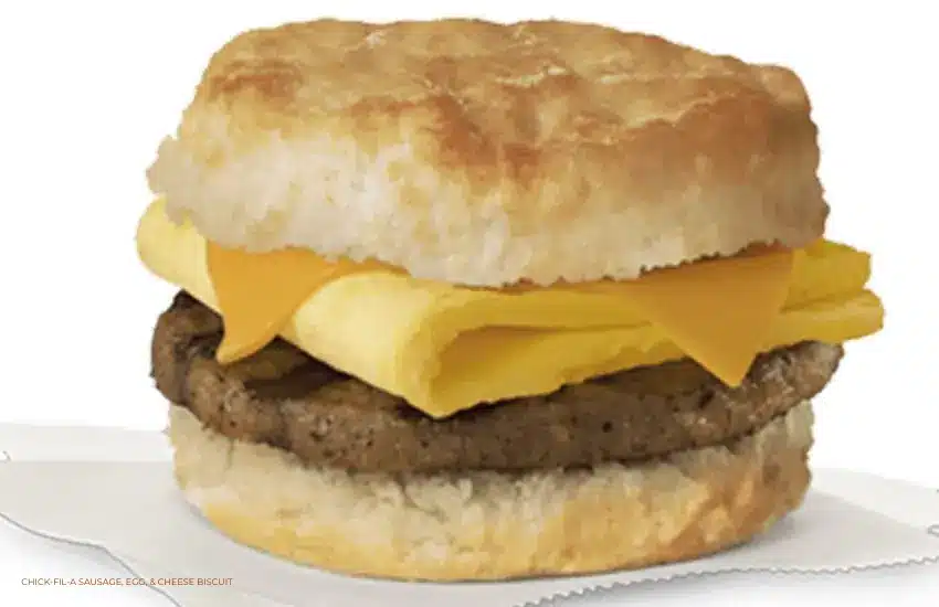 Chick-fil-A’s sausage, egg, and cheese breakfast sandwich is made with a pork sausage patty, folded egg, and a slice of cheddar cheese. The sandwich is served on a freshly baked buttermilk biscuit.
