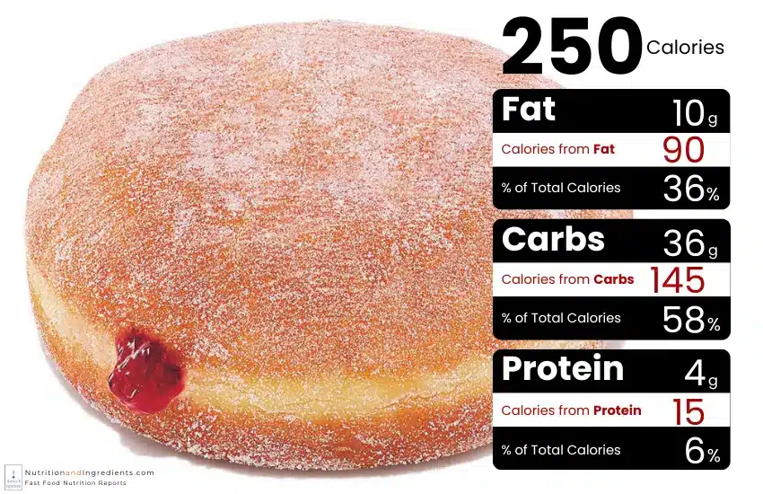The 36 grams of carbohydrates per Dunkin’ jelly donut contribute the greatest proportion of total calories. Carbs include one gram of dietary fiber and 13 grams added sugars.